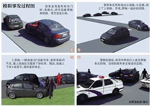 11號下午5點半,在北京亞運村車市門口,一名奔馳車司機與夏利車司機發生口角。據夏利車司機田先生回憶,爭吵之后奔馳車一直緊跟其行駛,17時45分許,迎面一輛黑色奧迪Q7逆行攔在了前方,而田先生撞進了綠化帶,接著4名中年男子從奧迪車上下來開始毆打他,同時奔馳車主手持田先生證件,打電話稱查查這人什么身份。隨后又趕來20多名手持鐵鍬的人,喊奔馳車主大哥。待民警趕到后奔馳車主揚言“我老婆是海南公安局局長,我哥哥是武警隊長”…