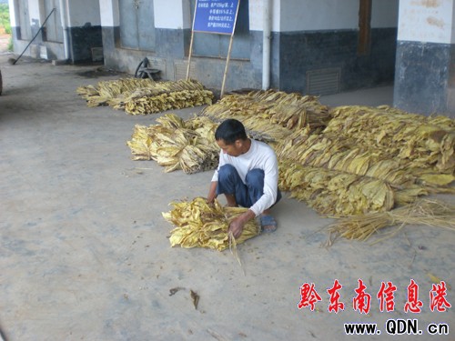圖為煙農(nóng)對烘干后的烤煙進行捆把儲存待收購