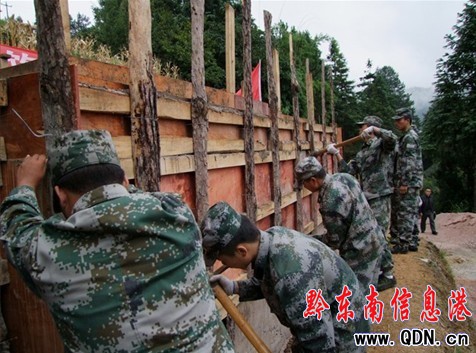 為解決受災群眾飲水困難,凱里市人武部先后組織官兵300余人次為三棵樹鎮平樂村第8小組村民修建一座能儲存水量20多噸的軍民共建飲水池。目前,該工程修建已進入了尾聲,即將解決全寨21戶103人、150多頭大牲畜飲水困難問題。圖為官兵們修建飲水池時的鏡頭。(楊再金)