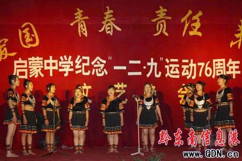 12月8日晚7點,啟蒙民族中學的學生在激情歌舞,紀念“一二•九”運動76周年.當日晚,該校師生歡聚一堂,以高唱歌曲、展現舞蹈的形式,激發學生的愛國熱情,弘揚革命的光榮傳統.圖為精彩歌舞的情景。(姜巨標 攝)