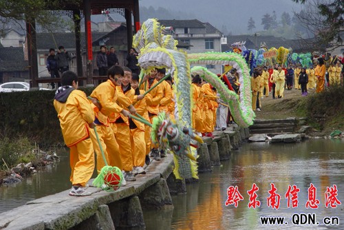 為了弘揚和繼承古城歷史這一非物質文化遺產,隆里中小學近年來把舞龍表演作為教學內容引進課堂,每逢元宵節和重大節日,隆里古城少年舞龍隊走出課堂校園,走向社會,與隆里古城成年舞龍隊為貴賓和中外游客一起舞龍表演,學校的少年舞龍隊表演,貴州省民政廳、貴州省文化館領導多次到隆里古城調研花臉龍文化進課堂的情況,少年舞龍隊的精致表演得到了貴州省文化部門的充分肯定和高度評價。如今少年舞龍隊成為隆里古城花臉龍表演的傳承人,勇挑起了元宵節舞龍狂歡和重大迎賓舞龍表演的重擔,成為隆里古城花臉龍表演的一道亮麗風景線,引起中外專家學者和游客的廣泛關注。每到元宵節狂歡,省內外各家媒體和攝影師涌集隆里采訪拍照。圖為隆里古城少年舞龍隊在2012年隆里舉行狂歡節活動中充當排頭在平水石橋上的舞龍精彩表演。(石福濤 攝)