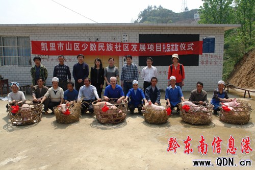 2012年4月11日,國(guó)際小母牛新西蘭捐贈(zèng)者安得魯先生到凱里市旁海鎮(zhèn)大溪村發(fā)放《凱里山區(qū)少數(shù)民族社區(qū)可持續(xù)發(fā)展項(xiàng)目》首批禮品,開(kāi)普威汀基金會(huì)陳婭女士、海惠云貴區(qū)域辦主任李志南先生及凱里市畜牧獸醫(yī)局和旁海鎮(zhèn)政府領(lǐng)導(dǎo)參加了發(fā)放儀式,凱里市旁海鎮(zhèn)大溪村5個(gè)村民組的50戶農(nóng)戶接受了捐贈(zèng)。