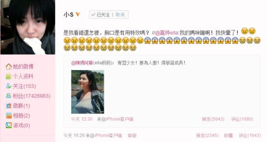 14日中午12時30分Ella媽媽在新浪微博中曬出Ella年輕時候的靚照,照片中的Ella一頭秀發披于肩后,銷魂攝魄的眼神,淡淡的微笑令人陶醉,最惹眼的是Ella那時候的美胸,有點尖尖實在有些不太尋常。性格大大咧咧直爽的小S看到照片后一針見血,轉發評論稱Ella胸器是否有特效,“是我看錯還怎樣,胸口是有用特效嗎?”眾網友紛紛響應同問此問題。女兒Ella則狂呼:“我的媽咪蹦啊!我快暈了。”