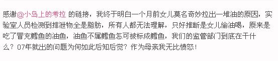 馬伊俐寫道:“我終于明白一個月前女兒莫名其妙拉出一堆油的原因,實驗室人員檢測到排泄物全是脂肪,所有人都無法理解,只好推斷是女兒偷油喝,原來是吃了冒充鱈魚的油魚,油魚不屬鱈魚怎可被標成鱈魚,我們的監(jiān)管部門到底在干什么?2007年就出的問題為何如此后知后覺?作為母親我無比憤怒!”據了解,油魚主要用于提煉工業(yè)用潤滑劑,含有一種天然蠟酯。蠟酯在人體內難以消化,食用后容易導致胃痙攣。有些不法商人會將此魚冒充高價海魚如鱈魚等,但是食用該魚嚴重時會導致死亡。對此,身為父親的文章十分憤怒,在微博上怒罵道:“此時我就是一個普通的父親,我想對這些黑了心的商家以及監(jiān)管部門說幾句話:你們這幫XX,這事老子跟你們沒完。”