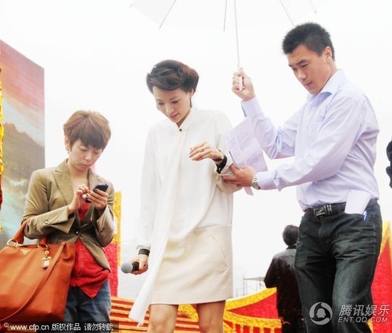 騰訊娛樂訊 江西省吉安市,4月19日,中國·遂川第二屆國際狗牯腦茶文化旅游節上開幕在江西遂川開幕。中央電視臺當紅主持人董卿與央視六套《愛電影》欄目的當家主持人蔣小涵、王翰濤兩位主持人聯袂主持,董卿身穿白裙主持驚艷全場,登臺時獲男工作人員打傘攙扶。