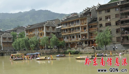 6月15日上午,鎮遠古城舞陽河面出現一道靚麗風景線,七八只烏篷船的船頭上站著身著清勇服裝的護航員,擁著兩只喜氣洋洋的漁船泛泛劃著,一對戀人正在用他們自己的方式見證他們的愛情,在鎮遠青山、綠水、古城的見證下,舉辦他們的婚禮。他們在美景中享受著浪漫,在浪漫中穿越歷史,在鎮遠古城感悟天長地久。(徐世釗)